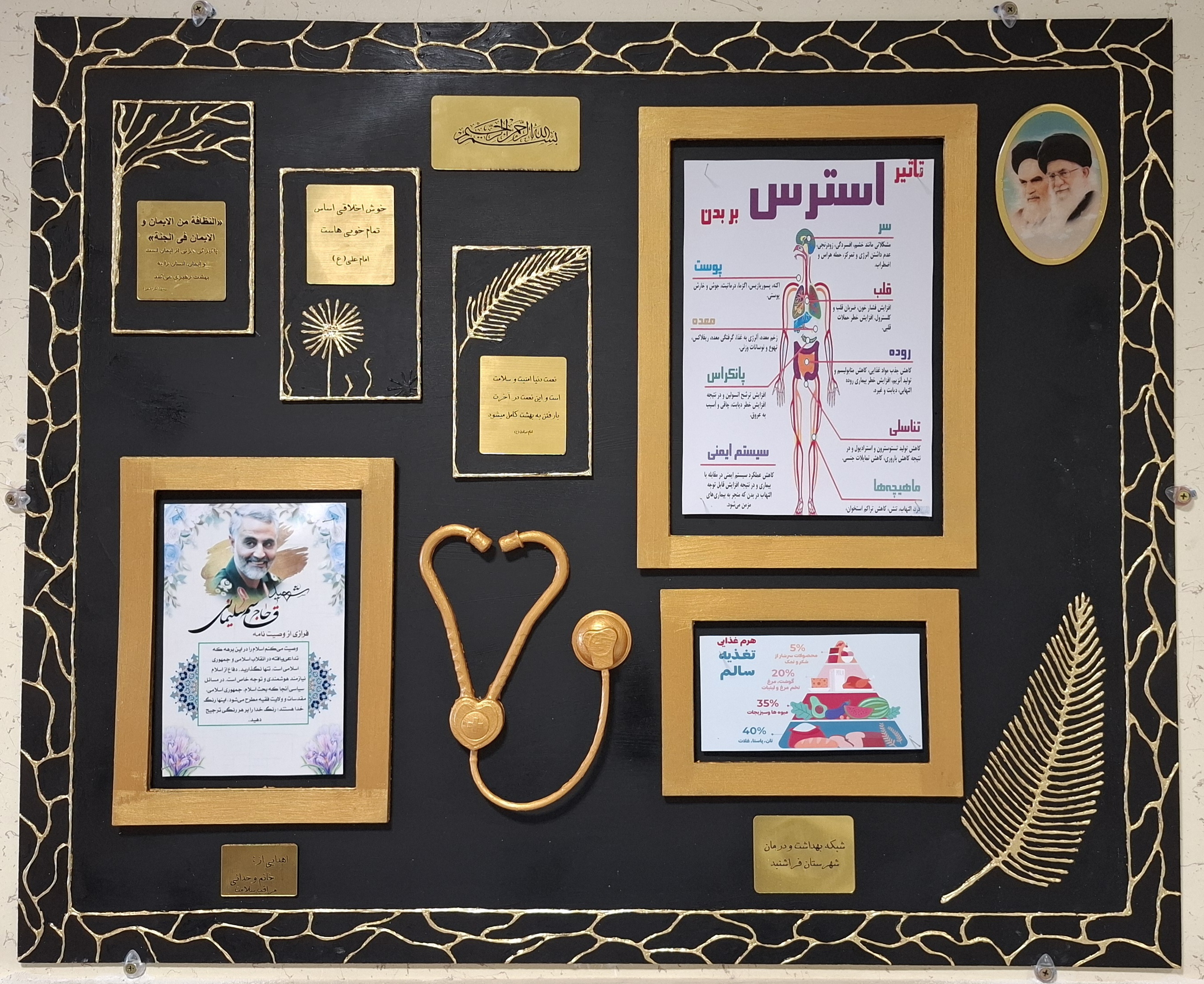 به گزارش روابط عمومی شبکه بهداشت و درمان شهرستان فراشبند، «ابراهیم اسکندری» مسئول روابط‌عمومی و فرهنگی شبکه با اعلام این خبر، گفت: این تابلو از جنس تخته سه‌میل، همراه با تکسچر و روکش طلایی با طراحی هنری و بهره‌گیری از رنگ‌بندی چشم‌نواز، قاب‌های نمادین، خطوط طلایی، برگ‌های تزئینی و همچنین قطعات مولتی‌استایل، جلوه بصری زیبایی ایجاد کرده است. در کنار این عناصر زیباشناختی، بخش‌هایی از پیام‌های آموزشی سلامت، احادیث و روایات و جملات انگیزشی و فرهنگی نیز در تابلو در نظر گرفته شده که امکان به‌روزرسانی و تغییر مستمر دارند و به این اثر، هویت کاربردی و زنده بخشیده‌اند.