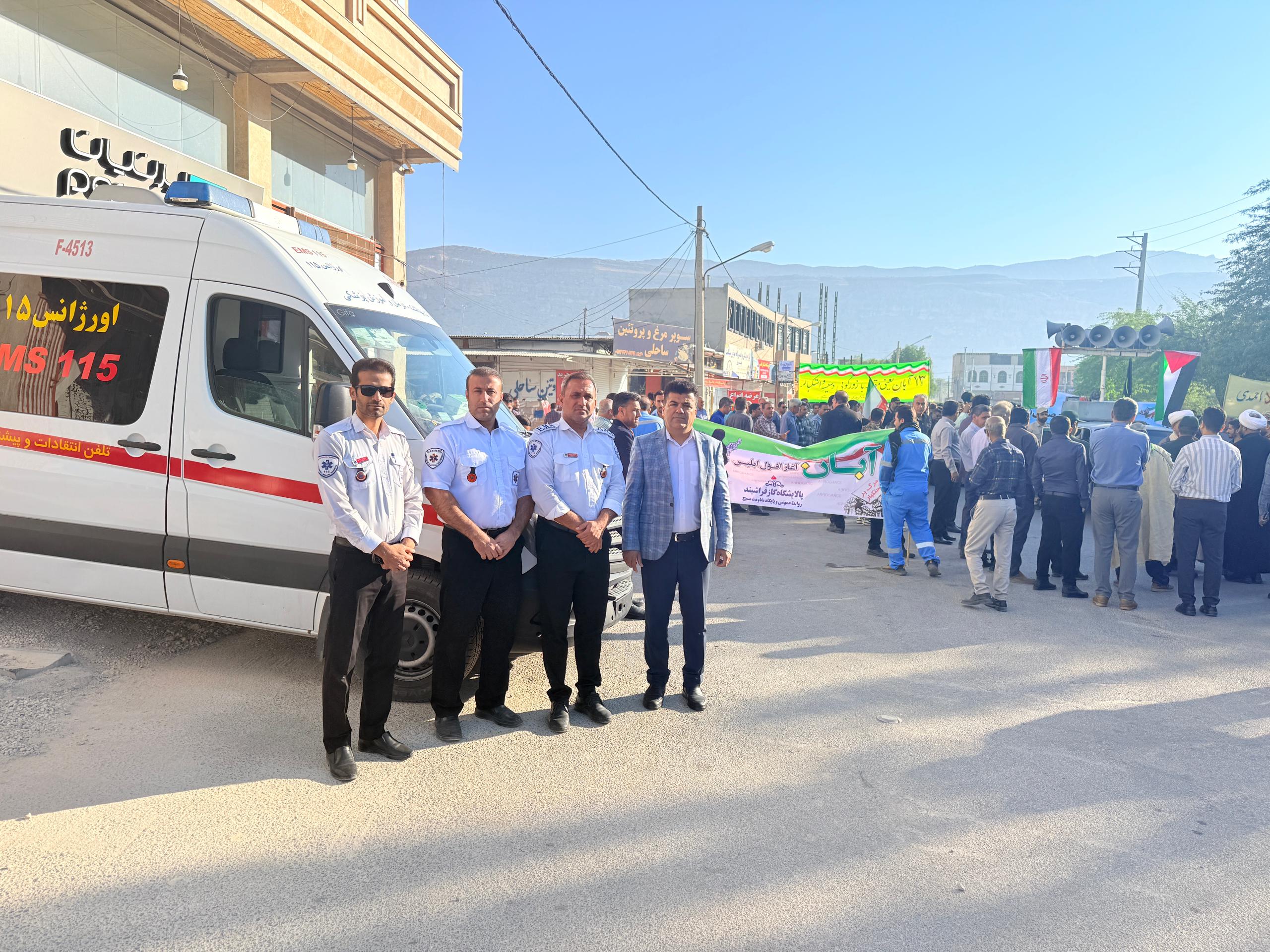 حسانی، یاد آور شد: آمبولانس اورژانس ۱۱۵ فراشبند نیز به‌صورت آماده‌باش در محل مسیر راهپیمایی حضور داشت تا در صورت نیاز، خدمات امدادی لازم را ارائه نماید.